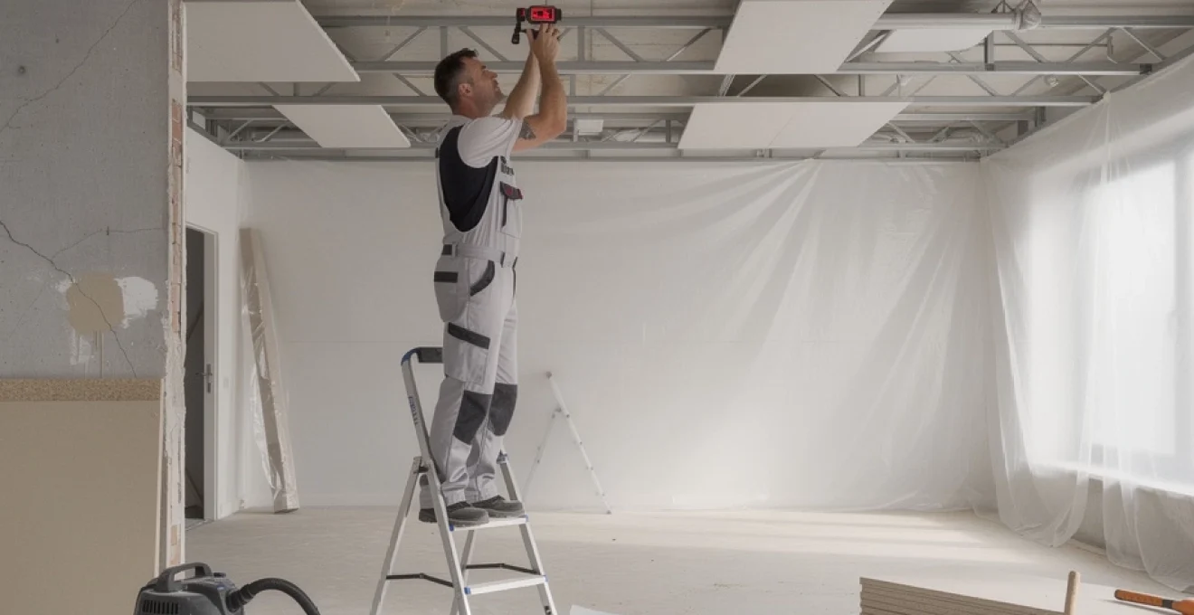 Vous allez donc enchaîner plusieurs opérations complémentaires : décapage des anciens résidus, dépoussiérage méticuleux, application d’un primaire adapté, puis protection des surfaces environnantes. Cette phase peut représenter jusqu’à 40 % du temps de chantier, mais elle garantit un plafond uniforme et durable, sans reprises visibles à l’endroit de l’ancienne cloison.